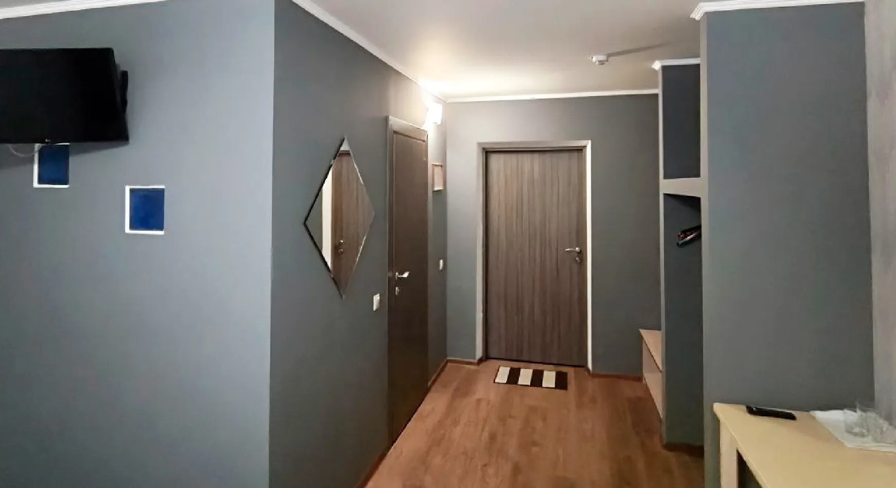 современная мебель: стол со стульями, тумбы, полки и вместительные отделения для одежды и багажа;